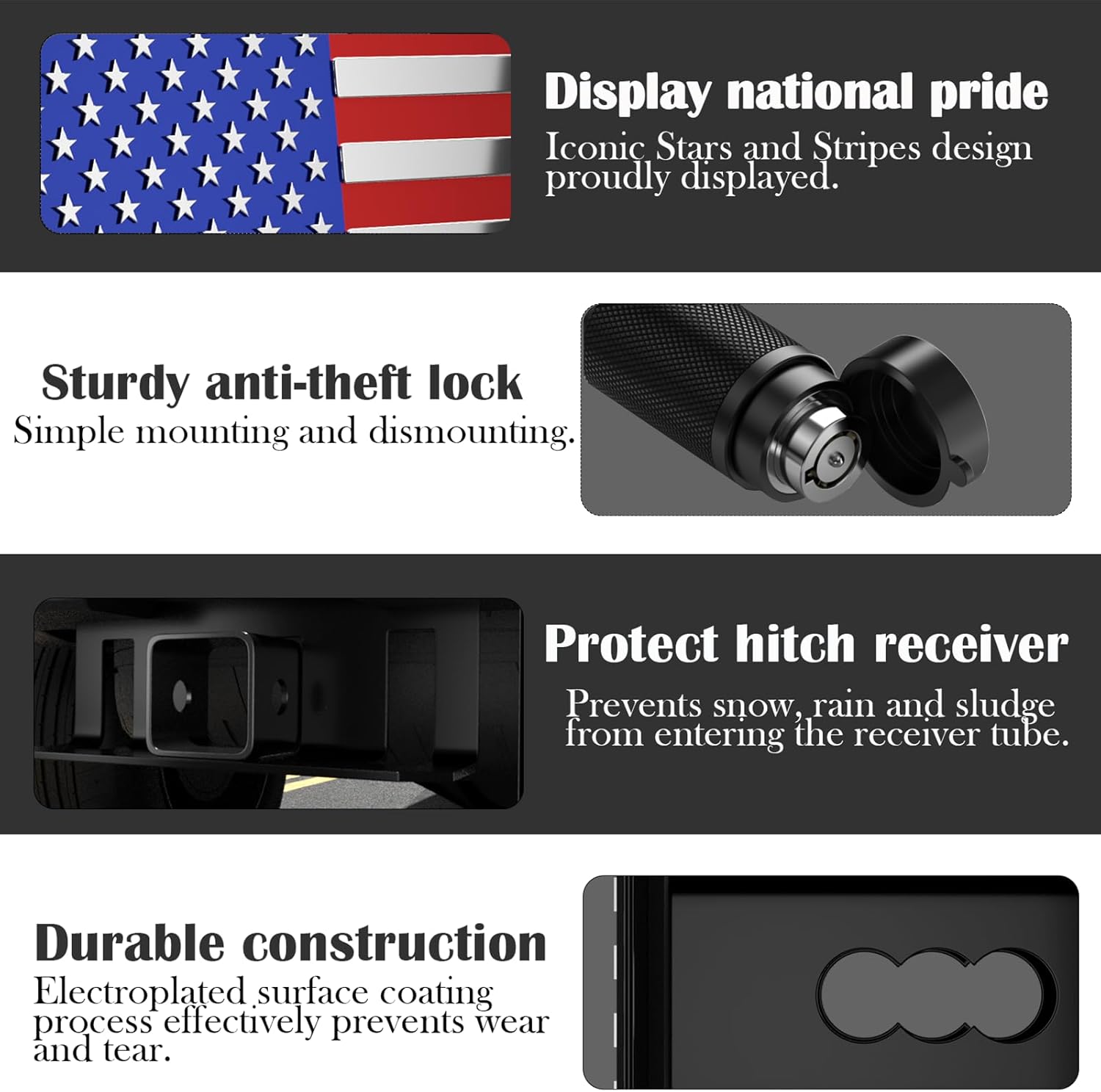 This is a trailer hitch cover for 2.5inch trailer hitch receivers.The 2.5 inch tow hitch cover panel features a unique design of the American flag flag, displaying national pride and flaunting patriotism, as well as making a great gift. The truck hitch cover is made of high quality heavy-duty stainless steel and the tow hitch cover is plated and coated. It protects the trailer receiver tube from mud, snow and debris. This trailer cover will fit all models with a 2.5" trailer hitch receiver. Examples include Toyota trailer cover, Chevy trailer cover, Jeep hitch cover,gmc hitch cover,ford 2.5“hitch cover,ram 2.5 inch hitch cover,tacoma hitch cover ect.(hitch covers 2.5 inch .5 inch receiver hitch cover railer hitch cover 2.5 inch eceiver hitch coverhitch covers for trucks)