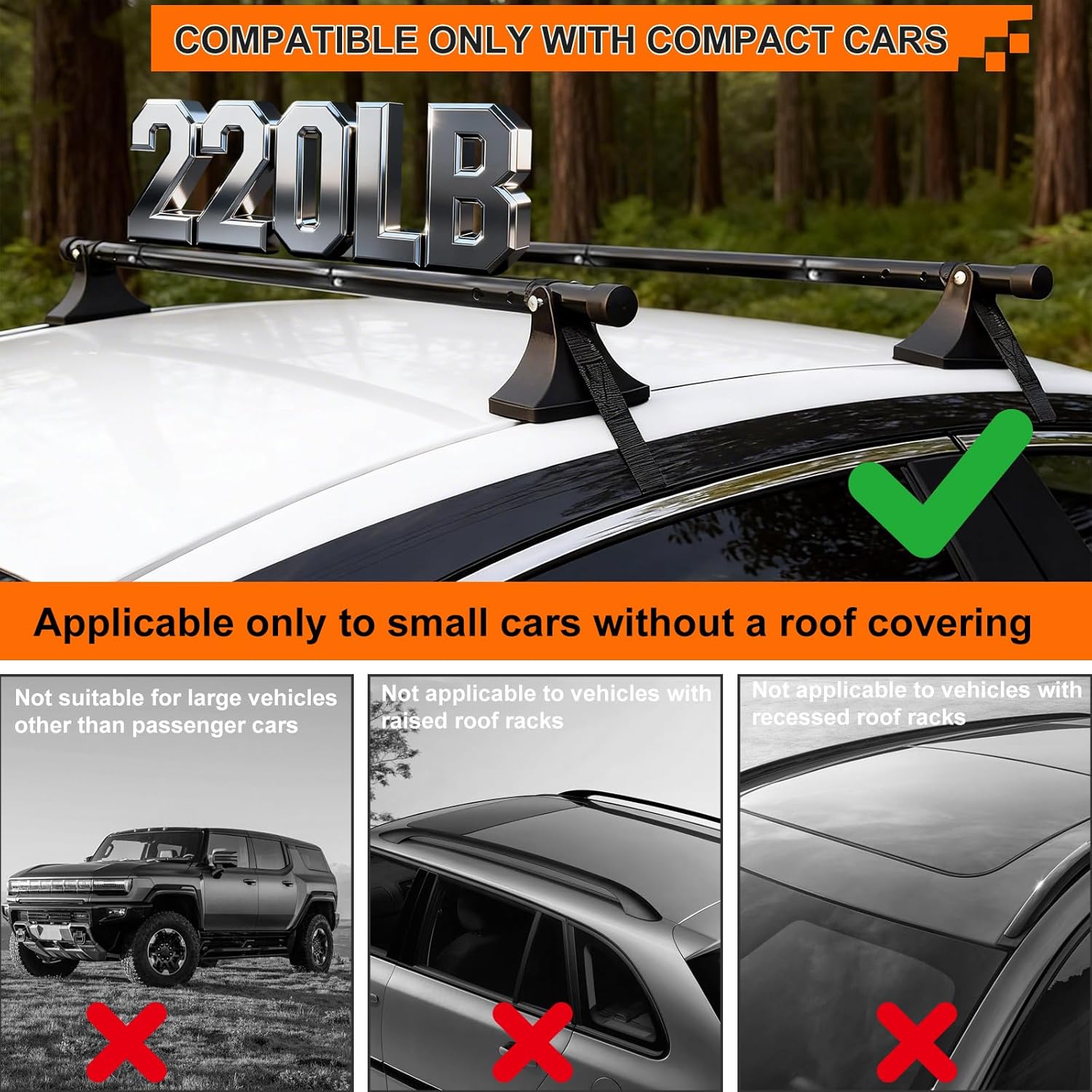 Upgrade vehicle storage space with Frebuta 48 Inch Roof Rack Cross Bars. Constructed with thickened iron pipe, this roof rack cross bars for sedan without rails and roof rack for compact car supports up to 220lbs for daily and outdoor cargo. This roof rack comes with high strength nylon ropes that can bear up to 800kg, providing reliable and stable fixation for all kinds of luggage and equipment. As a practical car top luggage rack for sedan, it fits closely to the roof with anti-warping design, making it a great choice as a roof rack for car without roof rails. With user-friendly no-drill installation, this no drill roof rack for sedan without rails and sedan roof rack without factory rails expands loading capacity without damaging your vehicle. It is widely used for carrying kayak, snowboard, cargo box and luggage, perfect for sedan owners who need extra roof storage. Avoid prolonged use in heavy rain to keep the rack in good condition.