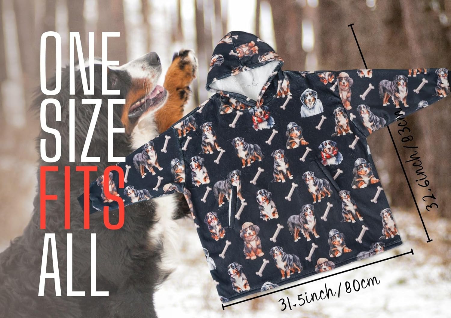 Bernese Mountain Gifts for Women & Men, Bernese Mountain Themed Wearable Flannel Blanket Hoodie, Oversized Hooded Sweatshirt, One Size, Black