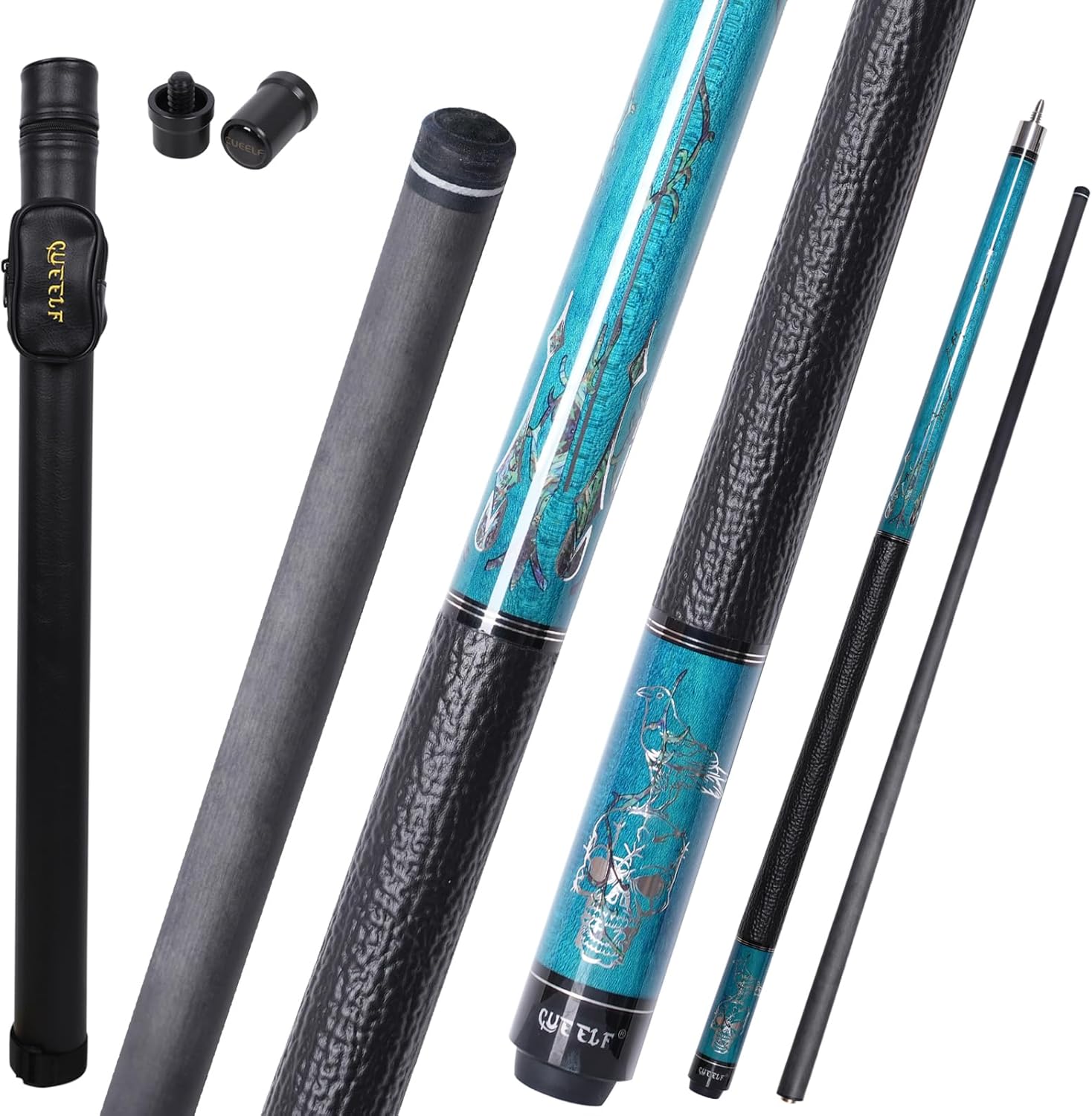 CUEELF Carbon Fiber Pool Cue Stick 58 inches Skull Billiard Cue Sticks Low Deflection Pool Sticks 12.5mm Tip Leather Grip Butt Technology Professional Cues.Using aerospace grade pure carbon fiber composite material,made of 100% carbon fiber.It comes with a high-end leather grip and is available in 5 colors.