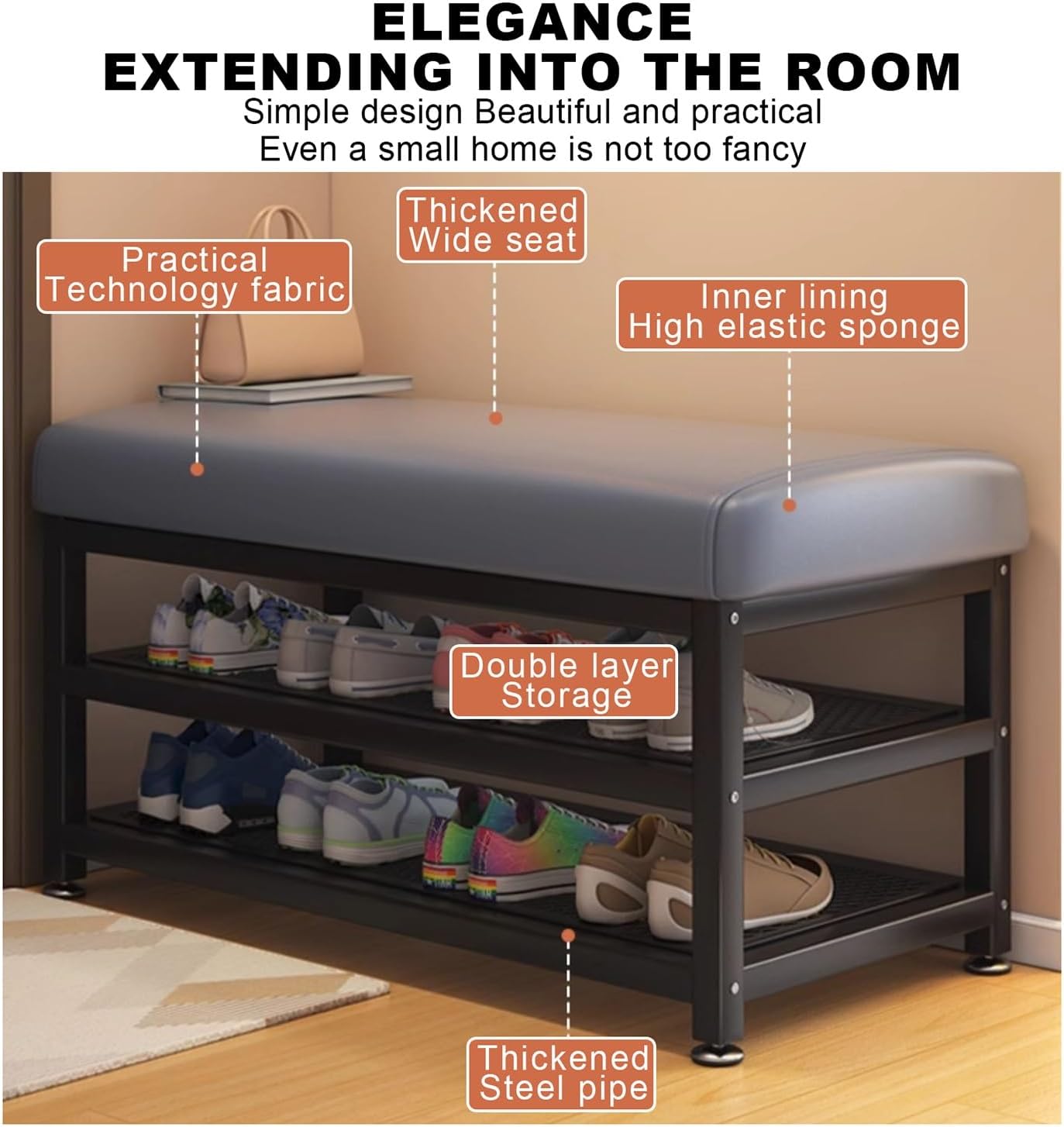 Bench with Seat Small Bench For Entryway Hallway Shoe Rack for EntrywayDual-Purpose Design – Combines a comfortable seating area with a hidden shoe storage organizer, eliminating the need for separate furniture pieces.Spacious Storage – The flip-top lid reveals a roomy interior that can hold 6-8 pairs of shoes, keeping them organized and out of sight.Sturdy & Practical – Constructed with a solid engineered wood frame and reinforced legs, this bench supports up to 330 lbs, ensuring long-lasting use.Soft Upholstered Cushion – The padded seat is upholstered in high-quality, easy-to-clean fabric, offering both comfort and style.Space-Saving Solution – With a slim, compact profile, this bench fits perfectly in tight spaces, making it ideal for apartments, entryways, or small homes.Easy Assembly & Maintenance – Includes all necessary hardware and straightforward instructions for quick setup. The smooth surface wipes clean effortlessly.Perfect for Any Home:Whether you need a shoe storage organizer for your entryway, a hallway bench for putting on shoes, or a living room storage seat, this versatile piece delivers both practicality and elegance. Its neutral design complements any decor, from contemporary to farmhouse styles.Notice:Children are not allowed to climb on or play with the storage chest for safety reasons.Assemble this product on a soft surface to prevent scratches.Solve the label removal method: You can use a hair dryer to heat the label.When a certain heat is reached, the label is easy to tear off.Due to manual measurement, please allow for a size deviation of 1-2 centimeters. Please refer to the actual product received for accurate dimensions.