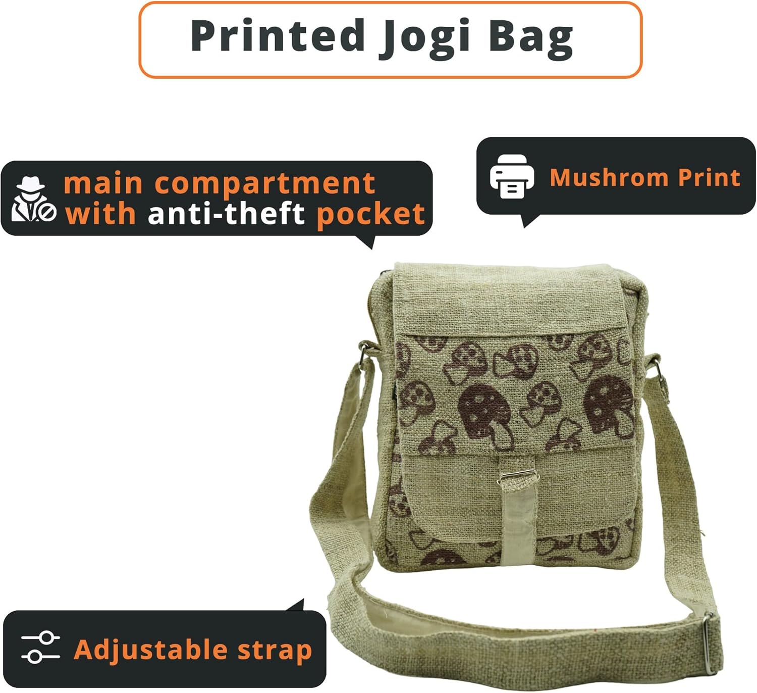 Embrace a bohemian chic style with this pure hemp canvas messenger bag. Crafted from sturdy and sustainable materials, it features a vibrant mushroom print that adds a touch of whimsy. The compact size and adjustable strap make it perfect for everyday use or travel. With its secure flap closure and interior pocket, you can safely carry your essentials. This handmade bag is a unique and practical accessory that effortlessly blends fashion and functionality. Elevate your look with this eye-catching yet durable crossbody bag.