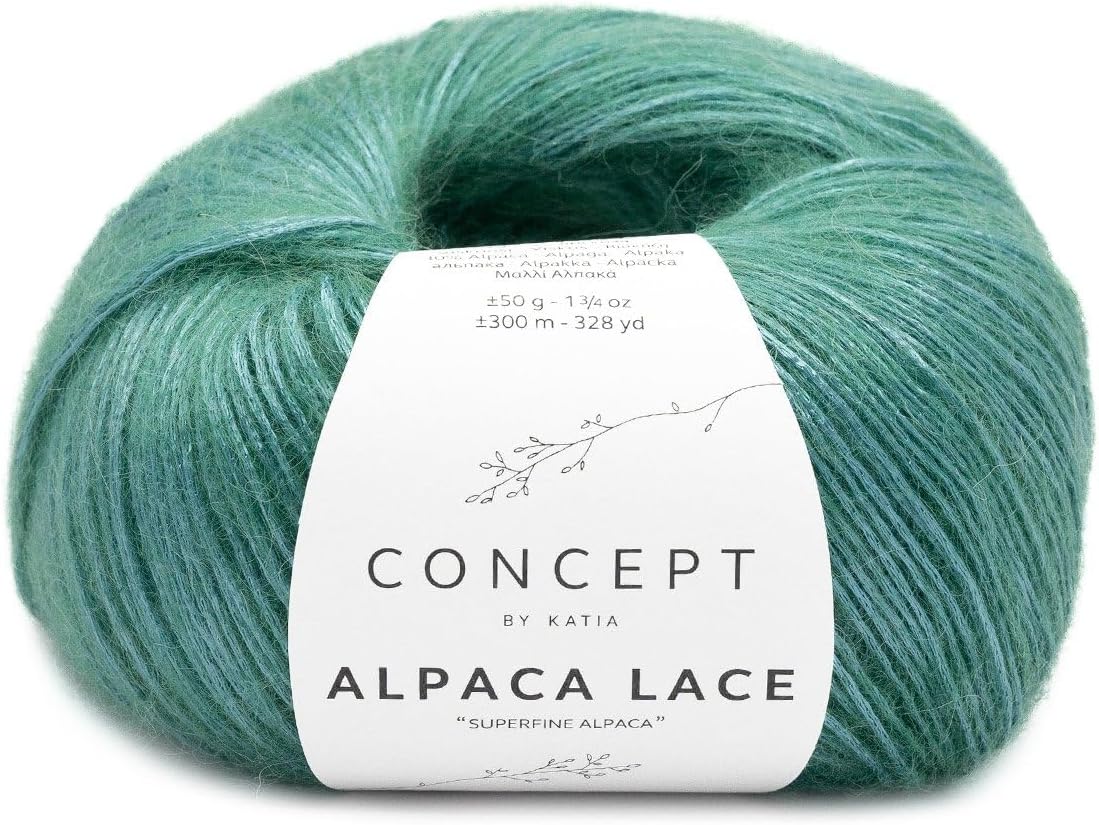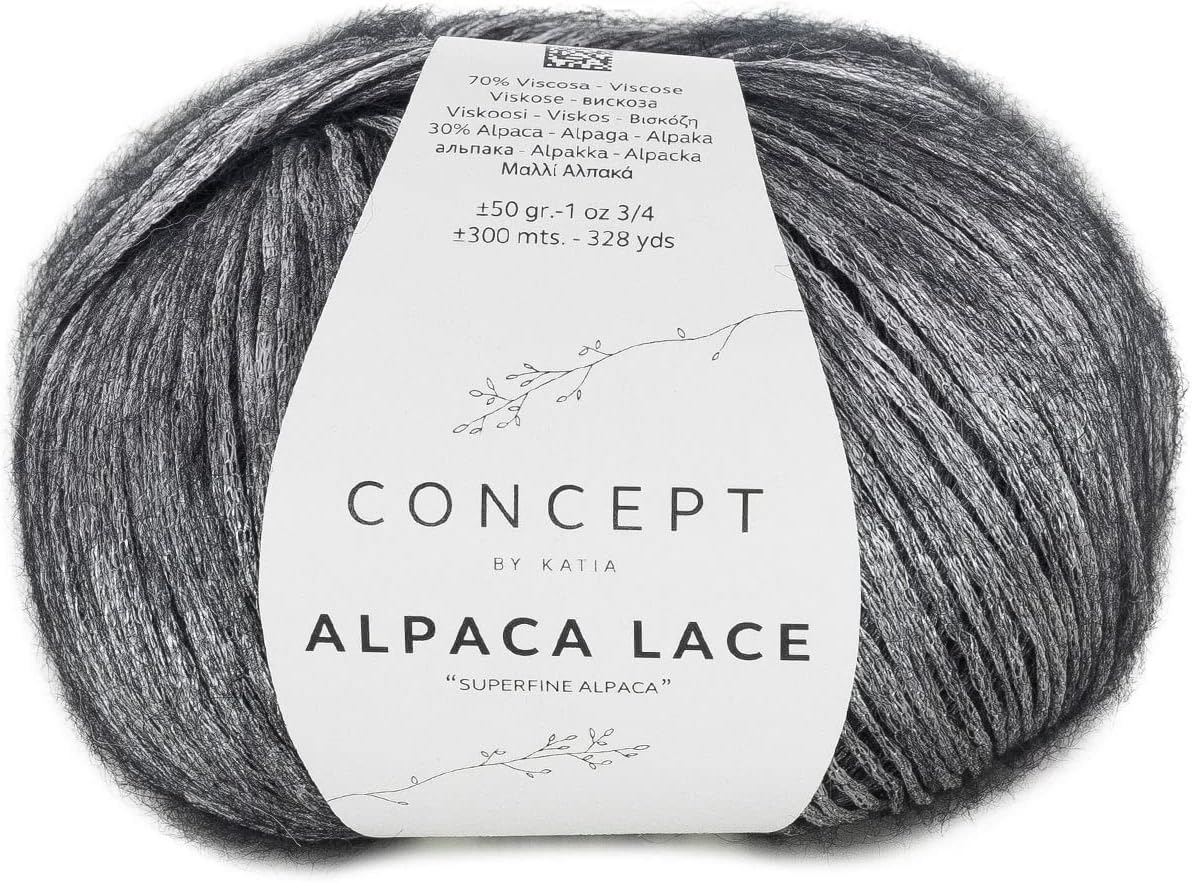 Concept by Katia Alpaca Lace: a blend of viscose with fine alpaca for delicate softness and airy designs. Hand wash. Composition: 70% viscose, 30% alpaca. Needle thickness: -3-3.5 mm. Length: -300 m/50 g. Consumption: approx. 5-6 balls for a jumper