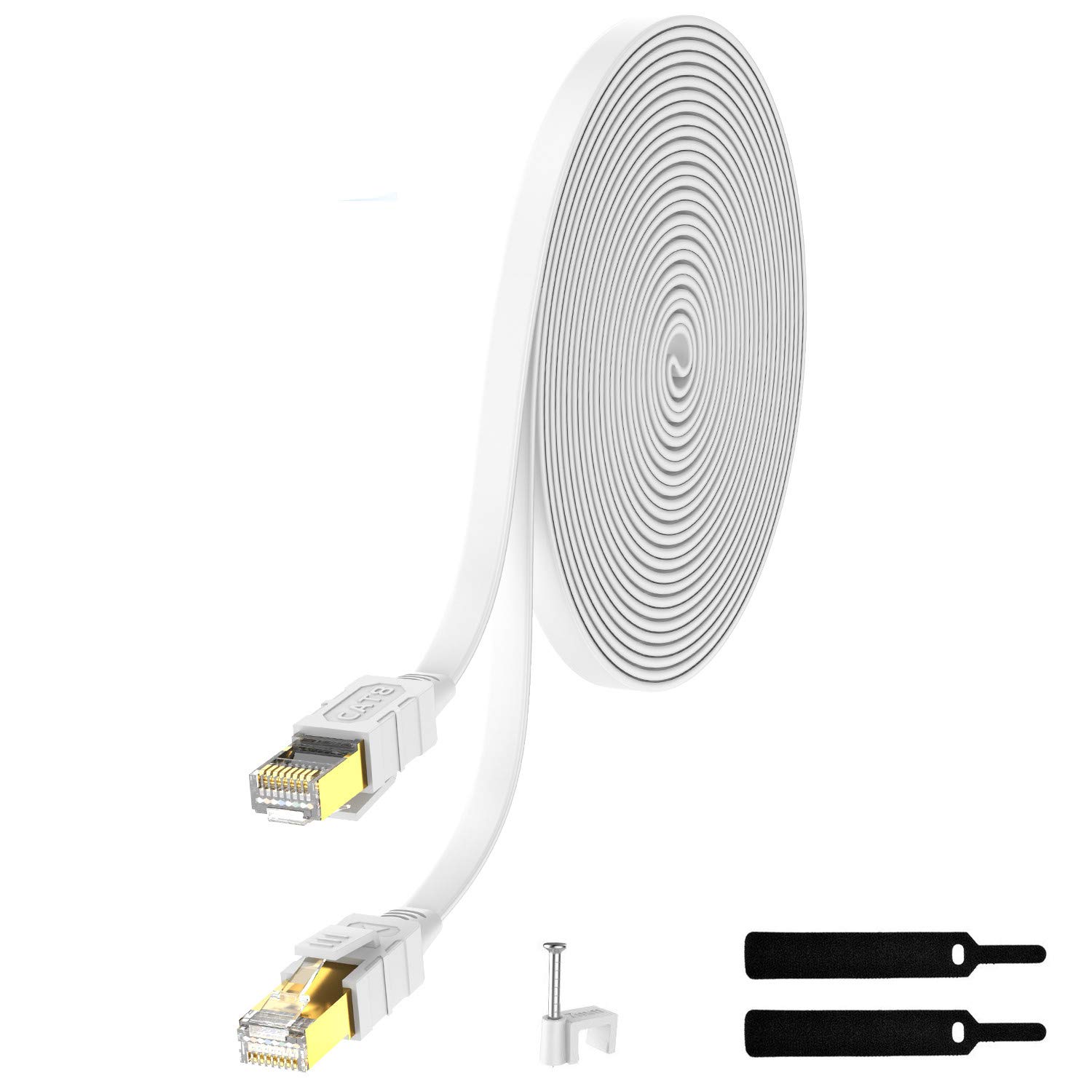 This high-speed Cat8 Ethernet cable allows for blazing fast network connections at home or the office. Featuring gold-plated connectors and four pairs of double shielded twisted copper wires, it supports transmission speeds up to 40Gbps and frequencies as high as 2000MHz. Perfect for networking desktops, streaming media, online gaming, IP cameras and more - this 100 foot cable ensures a strong, reliable connection across long distances. The flat design takes up less space than round cables for better cable management in crowded areas like under desks and behind entertainment centers. Constructed with robust materials, it has been tested to exceed Cat8 specifications for performance and reliability.