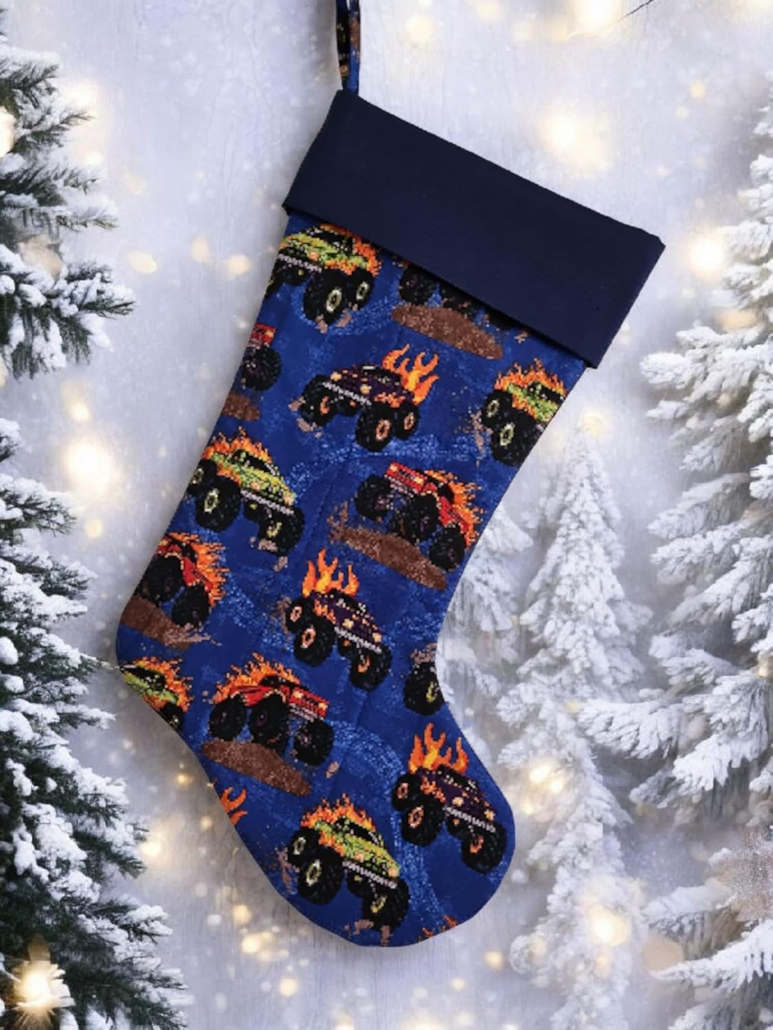Rev up your holiday decor with this eye-catching Monster Truck Christmas stocking! Set against a deep navy blue background, this festive stocking features a bold and dynamic pattern of flaming off-road vehicles in action. The design showcases various monster trucks jumping, racing, and crushing through terrain, complete with vibrant flame details and rugged wheels. Perfect for automotive enthusiasts and monster truck fans of all ages, this traditional-style stocking brings an exciting twist to your Christmas decorations. The generous size of 19 x 9.5 inches provides plenty of room for holiday treats and small gifts, while the durable construction ensures it can handle all your stocking stuffers. The navy blue cuff adds a classic touch to the contemporary design, making it easy to hang from your mantel or stocking holder. Whether for a child's room or a family gathering space, this unique stocking combines holiday spirit with high-octane style.