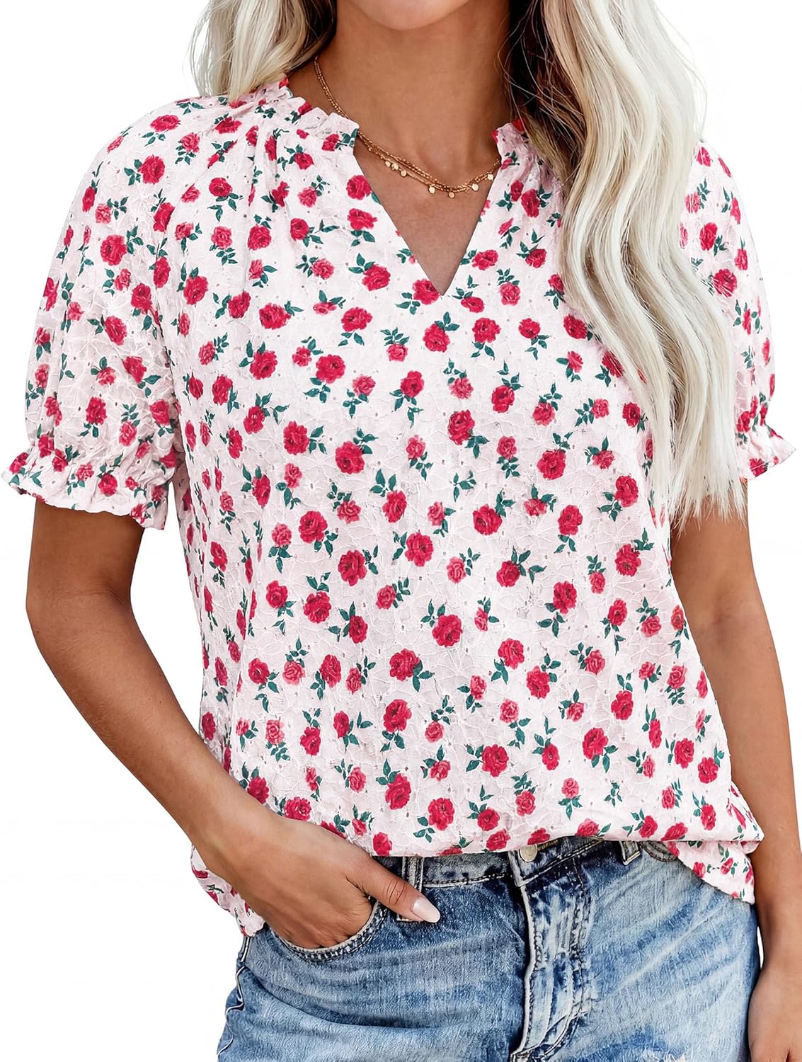 This short sleeve top features a beautiful bohemian floral print, embodying the free-spirited boho style for a trendy and fashionable look.The flattering V neckline is elegantly accented with delicate ruffle trim, adding a feminine and dressy touch ideal for going out or the office.Designed with a relaxed loose fit that drapes gracefully, offering all-day comfort whether you're at work, on vacation, or enjoying a casual day.The premium material ensures a soft touch against the skin, providing a comfy wear that is both breathable and gentle for all-day activities.The ruffled details and loose cut of this short sleeve top create a flowy silhouette that is flattering and movement-friendly.Designed for everyday wear, this ruffle shirt is made to be a durable addition to your clothing collection, maintaining its quality and print after washes.
