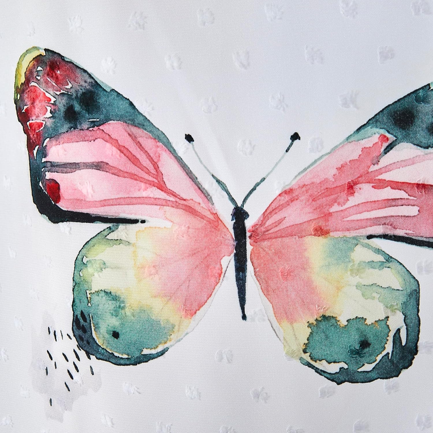 Bring the beauty of nature to your bath with the Butterfly Wishes shower curtain. This lightweight Swiss dot fabric features a beautiful butterfly print in a flowy, watercolor-like finish, created by Chicago-based artist Claudia Bianchi. Her work is a mix of whimsical graphics, fun patterns, colorful florals, and abstracts in a variety of different mediums. This colorful shower curtain fits in with many types of decor, from feminine and romantic, to cottage style, boho, or artistic. 12 button holes line the top for easy hanging. Use of a liner is recommended; hooks and liner sold separately.