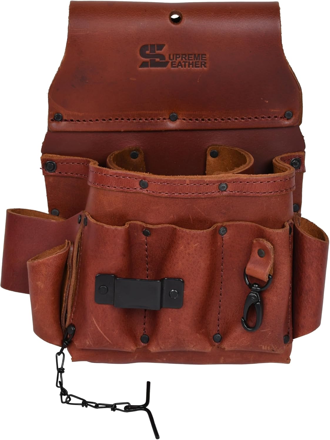 The Supreme Leather Electrician Tool Pouch is designed for professionals who need durability, organization, and easy access to tools. Made from high-quality oil-tanned top-grain leather, this heavy-duty pouch develops a unique patina over time, making it both functional and stylish. With 6 spacious pockets, a steel hammer loop, a tape measure clip, and a tape T-chain, this 13-in-1 tool organizer is ideal for electricians, carpenters, and contractors. Built with reinforced stitching and heavy-duty rivets, it ensures maximum durability in demanding job site conditions. The universal fit accommodates belts up to 3 inches wide, offering convenience and flexibility. Whether you're working on residential wiring, construction, or general repairs, this handcrafted leather tool pouch is an essential addition to your gear, combining strength, efficiency, and craftsmanship.