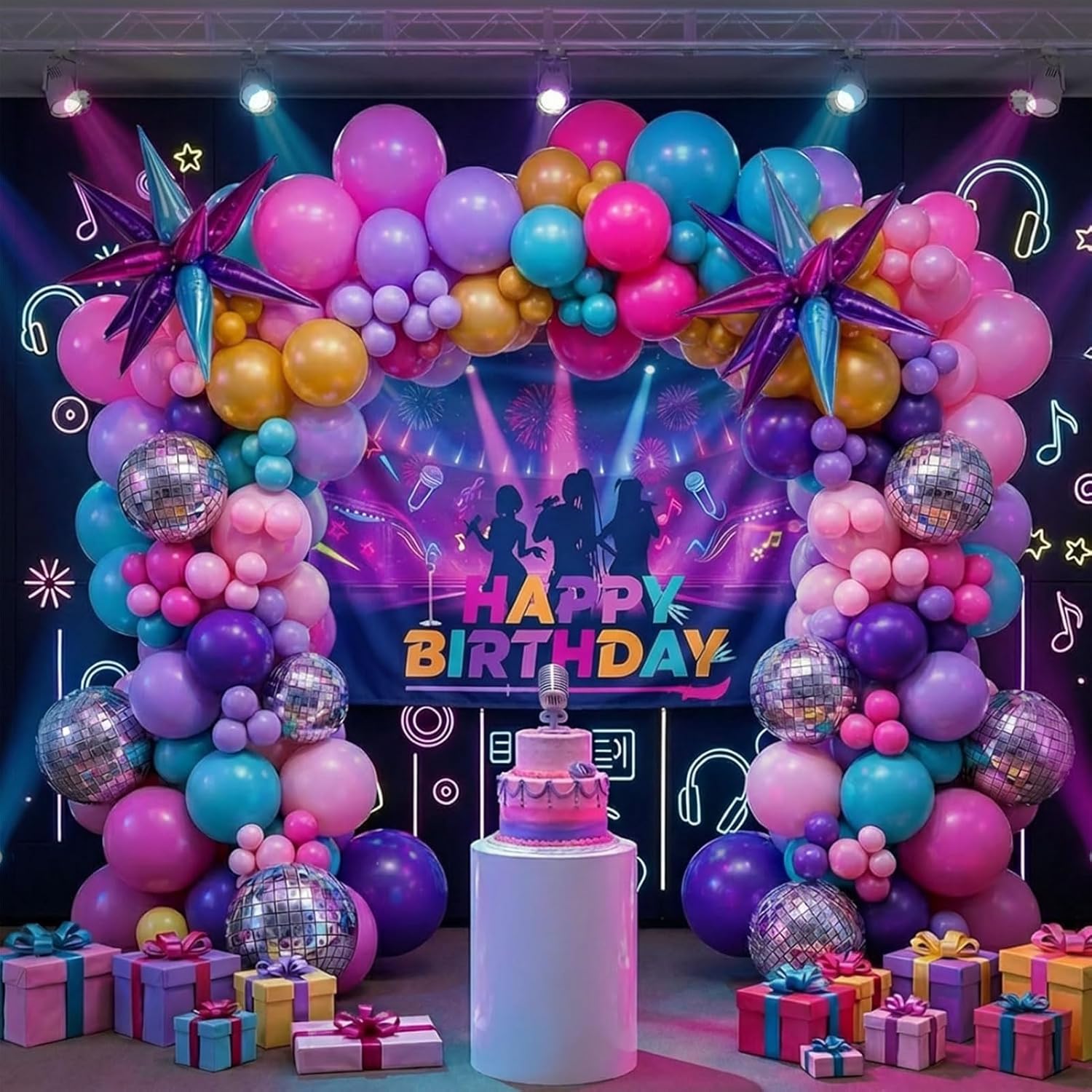 Unleash the energy of your Kpop Music Hunter birthday with our vibrant balloon party kit! Featuring a stunning color palette of Ruby Red, Teal, Yellow, Pastel Pink, Pastel Purple, and Pastel Blue balloons, accented with shimmering foil stars and disco balls. Transform your space into a dazzling celebration, guaranteed to impress!