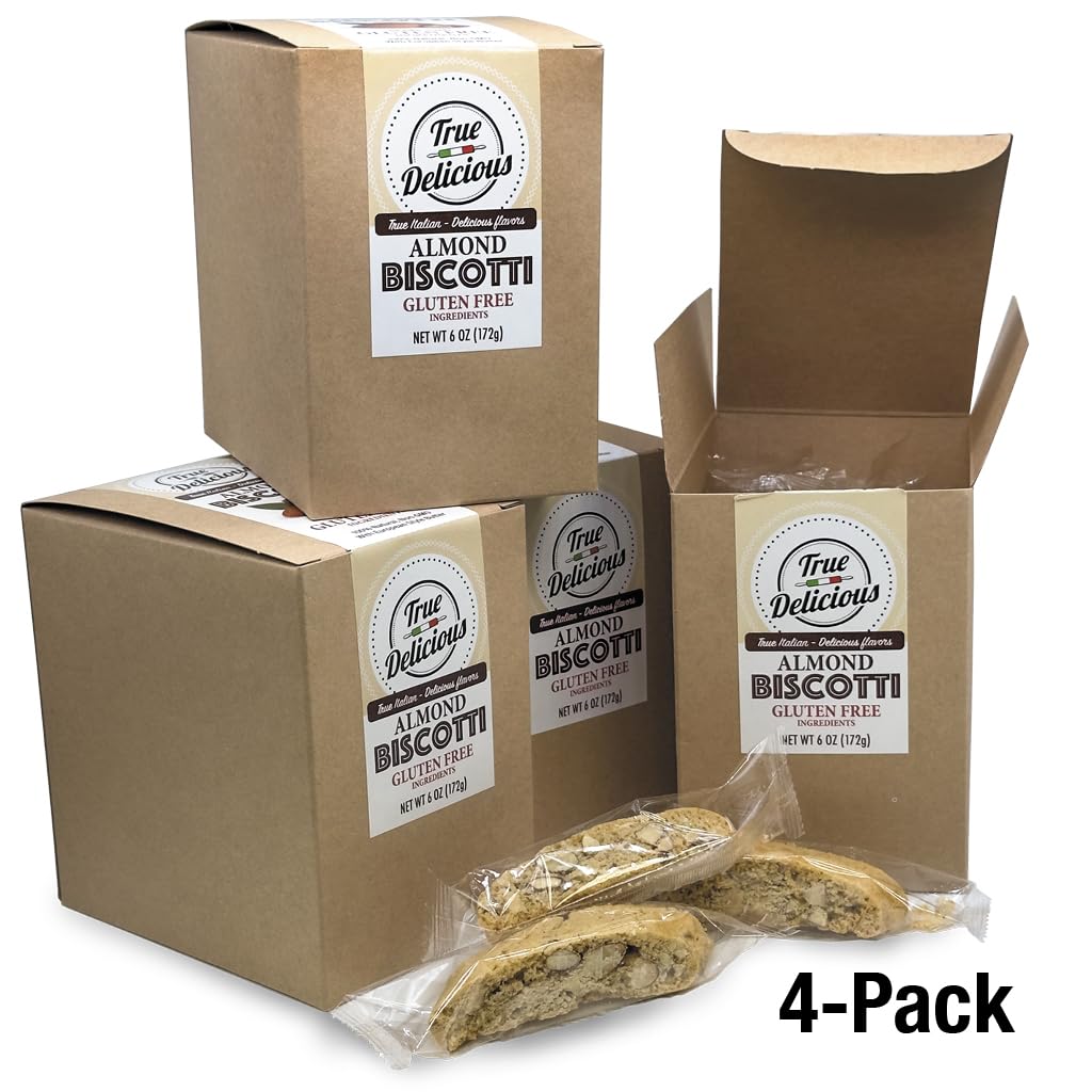 True Delicious Individually Wrapped Gluten Free Ingredients Almond Biscotti are made in Petaluma, CA with 100% natural, non-GMO locally sourced ingredients. These biscotti make a great snack, dessert or gift. They are great with coffee, tea, wine or just by themselves. Allergens: This product is made on shared equipment in a facility that also processes wheat, dairy, soy, peanuts, sesame and other tree nuts. In our kitchen we do our best to avoid all cross contamination. Our gluten free recipes are intended for people that are following a gluten free diet and for all people that have a non-severe gluten sensitivity. Not for celiacs.